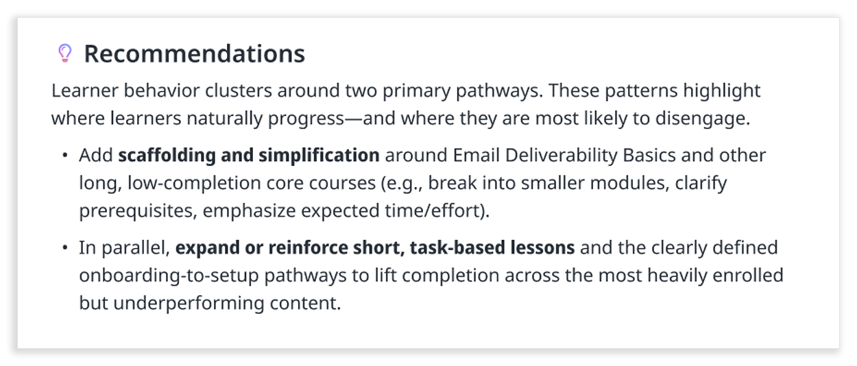 The way learners actually moved through content had made this analysis difficult in the past, and it had taken customers days to figure out, if they attempted it at all. Enterprise customers with significant BI investments could surface this insight, and we'd even set it up for some of them. They loved it. That's how we knew it was the right first question to tackle for everyone.