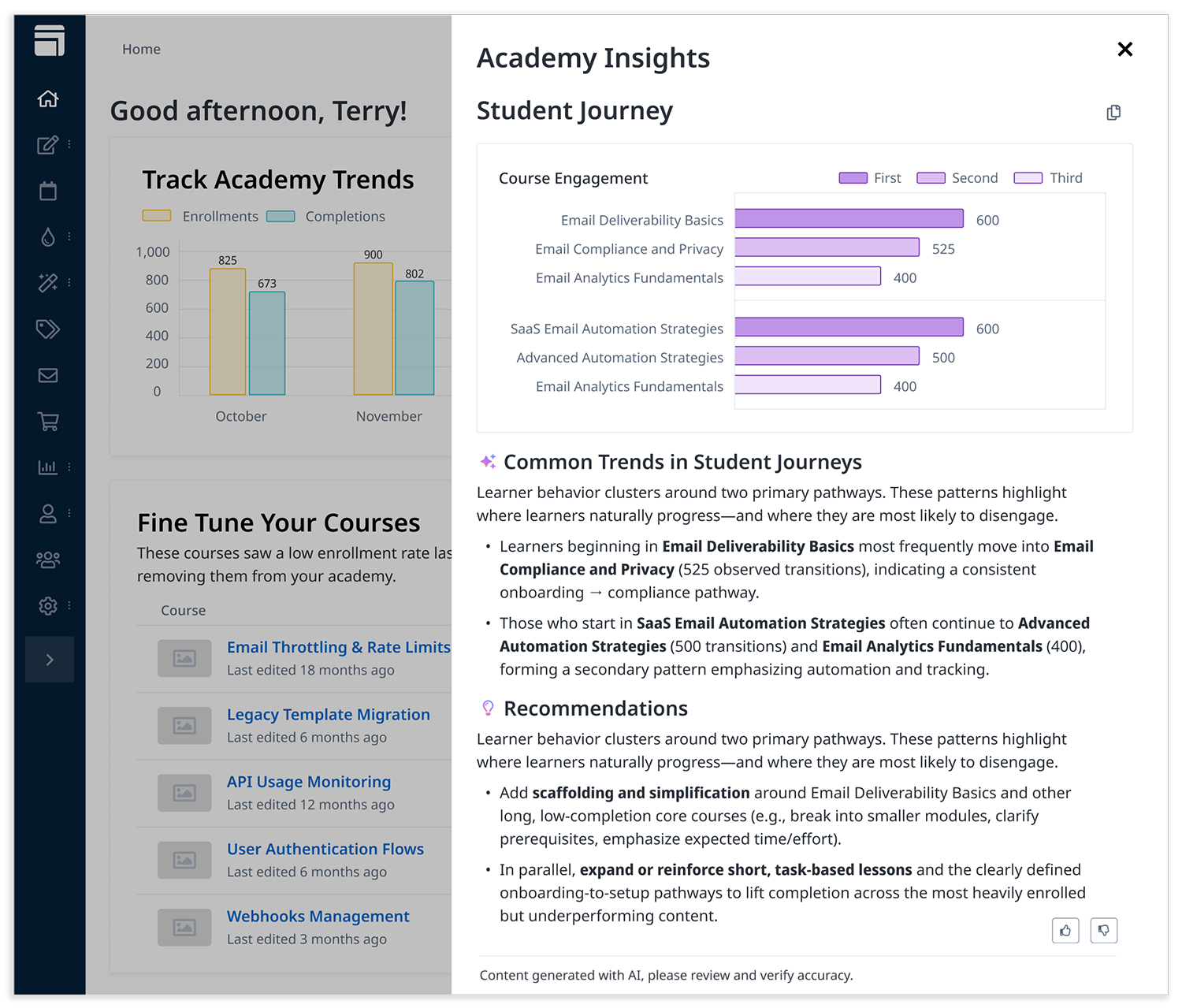 This was the first time the Skilljar dashboard included prose, which introduced new design considerations. Spacing, line heights, and line lengths were carefully tuned for readability. The voice and content were carefully defined within the prompt, and key phrases were selectively bolded to make scanning easier.