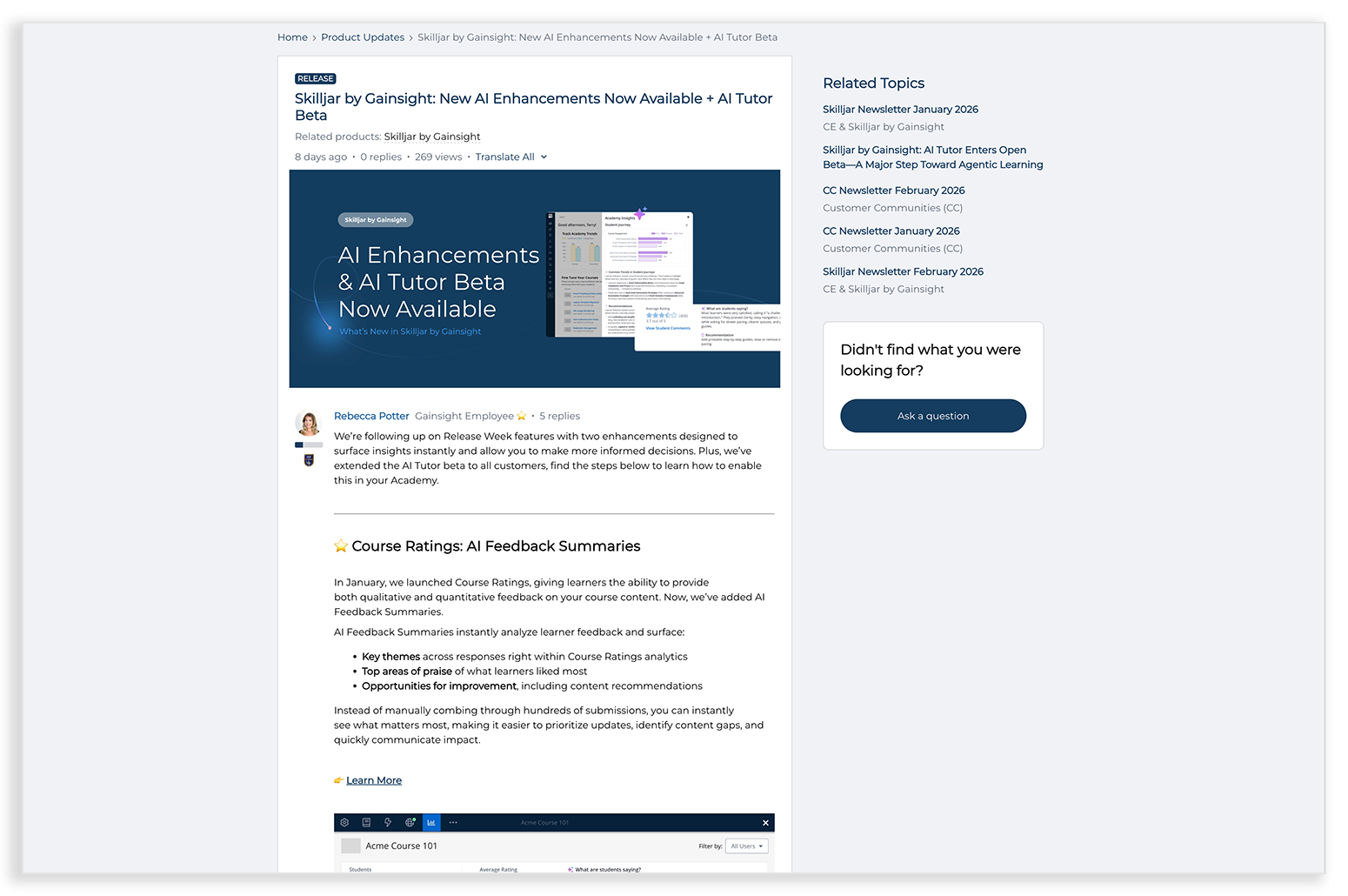 This work also established a foundation for how AI features should behave across the product. Patterns for trust, sequencing, and readability were designed to scale across the Skilljar dashboard and the broader Gainsight ecosystem.