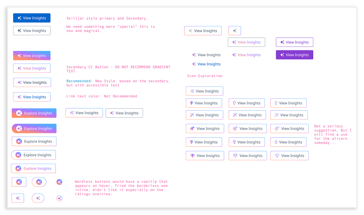 Ultimately, a secondary button with a gradient border and icon was selected. It was shaped by judgment, critique, and emerging UI norms.