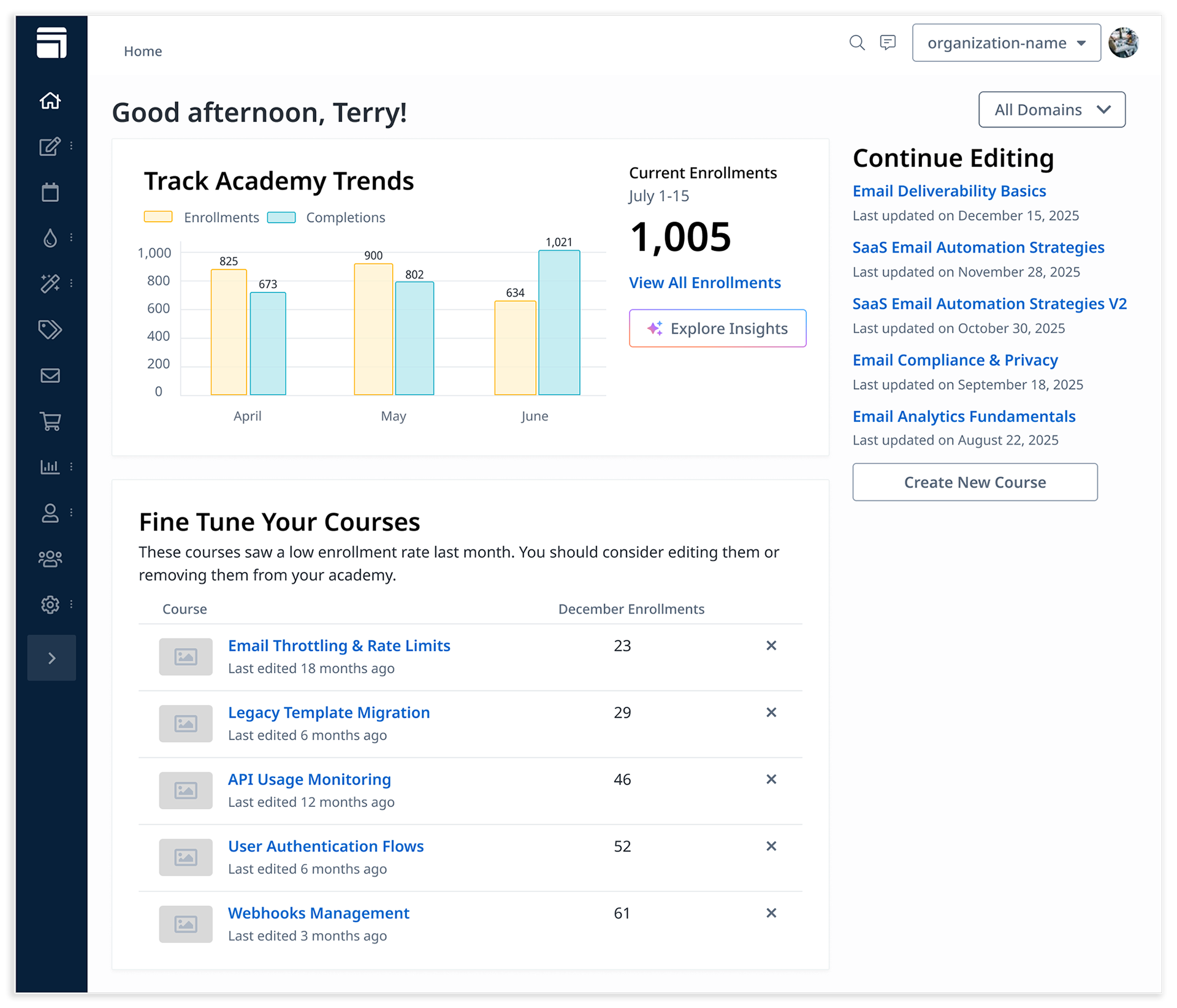 During the interviews several customers mentioned wanting a longer timeline on enrollments and completions. We ultimately limited enrollment trends to a three-month view. Displaying longer timelines would have required rebuilding backend infrastructure, delaying the launch. Instead, we linked users to the full enrollments report for extended data, delivering immediate value while leaving room for future enhancements. This kept the redesign lightweight, usable, and aligned with Phase 1 goals.